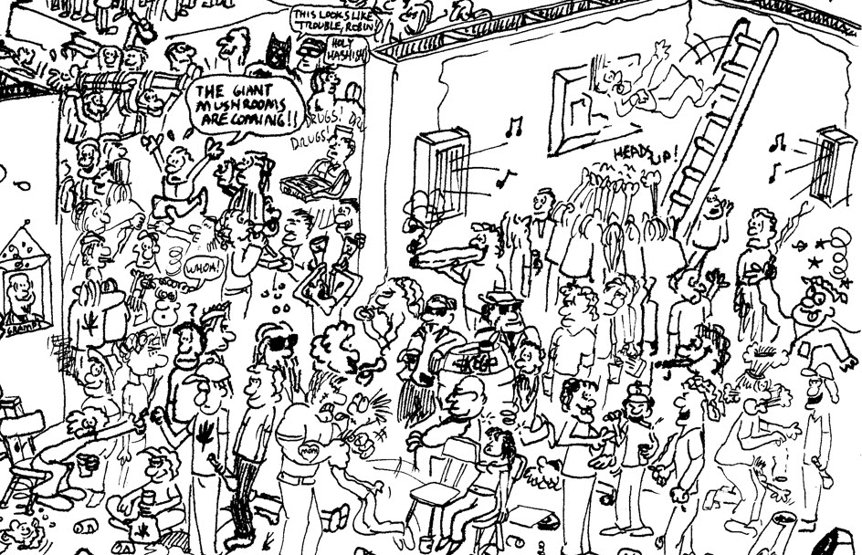 Marty asked Chas to guard his stereo, while he made the rounds to check on the house, and he saluted stiffly at attention, clicking his heels together.  The noise got louder as he entered the main room, because they’d placed the nuclear-powered speakers out there, so the stereo could be controlled from the relative tranquility of the bedroom.  He noticed a big difference in the crowd immediately.  Whereas kegger parties were often infused with a jolly spirit of drunken camaraderie, the addition of toxic chemicals hardened the participants, fracturing them into distrustful little clusters of anxiety that were suspicious of all the other groups.  Someone he didn’t know told him the sophomores in the corner were doing acid.  Marty looked over, and Tom was making a fort out of the couch cushions with Randy inside.  All around him, the people who didn’t have cocaine were ceaselessly pushing through the crowd in search of more, while those who did have some were paranoid and arrogant.  It felt more like being in a P.O.W. camp than a party.