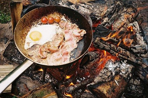 I had brought real bacon and eggs for this special morning: the boys’ first breakfast at Little Bear Lake! After the appetizers were consumed, I set about creating an authentic camp spread. Logan the Fire Master had a good campfire going, and I raked some coals aside for the frying pan. First, we had fresh scrambled eggs with garlic, onion, and peppers I had chopped ahead of time and folded in plastic wrap. I tapped out a few drops of Tabasco sauce onto my portion, so smug in my cleverness to have saved 1.5 ounces by transferring the elixir to a tiny plastic bottle. The next course was applewood smoked and peppered bacon, which I had wrapped in five layers of Ziploc bags to keep the bears from following me up the trail. The dogs were extremely vexed to find they had been tricked into eating their kibble, when there was still bacon to be had! They paced around like hungry lions, sniffing indignantly wherever the tantalizing bacon smell wafted. I carefully gave them the grease after it cooled, and it was amazing to see how only two dogs could look like a full-on rugby scrum. I wanted them to get every last bit so there would be no enticing smells to attract ursine visitors. Bears can smell bacon about a hundred miles away, and they’ll fly in if they can’t find a cab. It was an extravagant feast, and we ate it at the best table down by the lake. The boys were in excellent spirits after packing all eight corners of their stomachs. One may nod sagely about the finest restaurants in Europe, or extol the lavishness of an Emperor’s banquet in China, but outdoor dining at Little Bear Lake is the stuff of gastronomic legend!