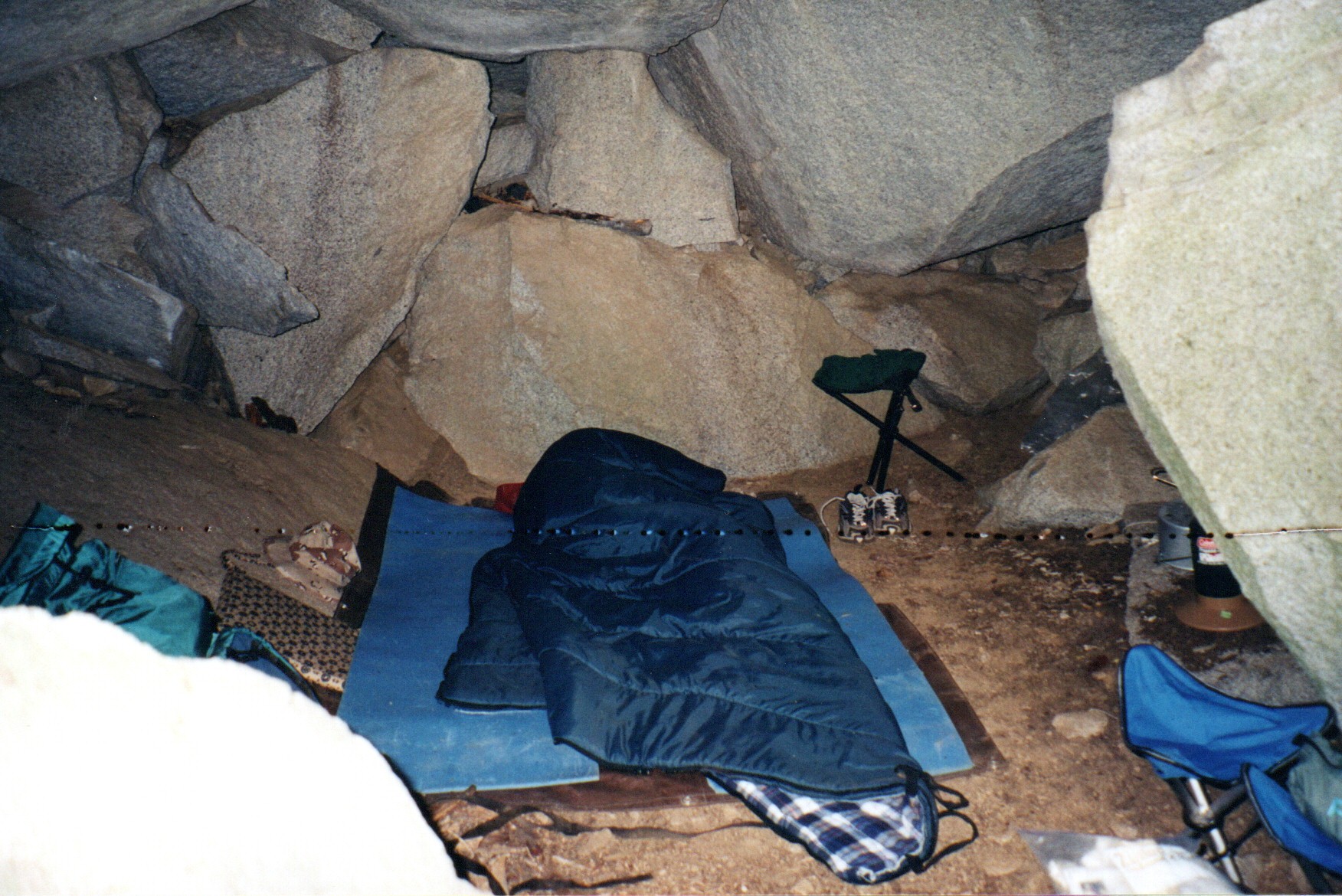 We bustled about with over-preparation, knowing that to stop and lie down would be the end of control over what happened next. The gray crack that was the opening faded to black, and we were crowded by the boulders that now seemed to be leaning inwards, as if to snuff out the light from my headlamp. “Good night,” I said as normally as I could, and switched it off. Blackness poured in and filled the cave with still, liquid silence, like being immersed in crude oil. No sound could be heard from outside. Then, from all around us, little varmint rustlings emanated tentatively from deep within the cracks. There was probably a labyrinth of rodent gangways throughout the entire rock pile! Our eyes could not see a thing, so our senses of hearing and touch were amplified. We could sense the anxious movements of the critters as they bustled all about us on their nocturnal errands. I could hear the scuffling of their little claws on the hard rocks. The graveyard shift was just beginning, and all the workers were hurrying into their positions on the line. Pitter-patter! Rustle! Nibble-nibble! Snap! Every tiny noise grew to a crescendo of cymbals at an orchestra. It was going to be a lo-o-ong night!